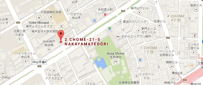 生田神社 (이쿠타 진자), 生田警察署(이쿠타 케이사츠쇼)를 지나 山手幹線(야마테간센) 도로의 神戶稅務署 건너편의 3층 건물입니다.